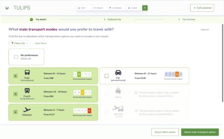 Studies with 445 participants confirmed that the TULIPS TRIP platform improves user awareness and supports sustainable travel decisions. Travelers prioritize speed, cost, and comfort, but environmental considerations are increasingly important, particularly for air and train travel. Clear CO2 information, combined with intuitive visual cues and prompts, successfully guides users toward greener choices, demonstrating measurable potential for emission reductions.